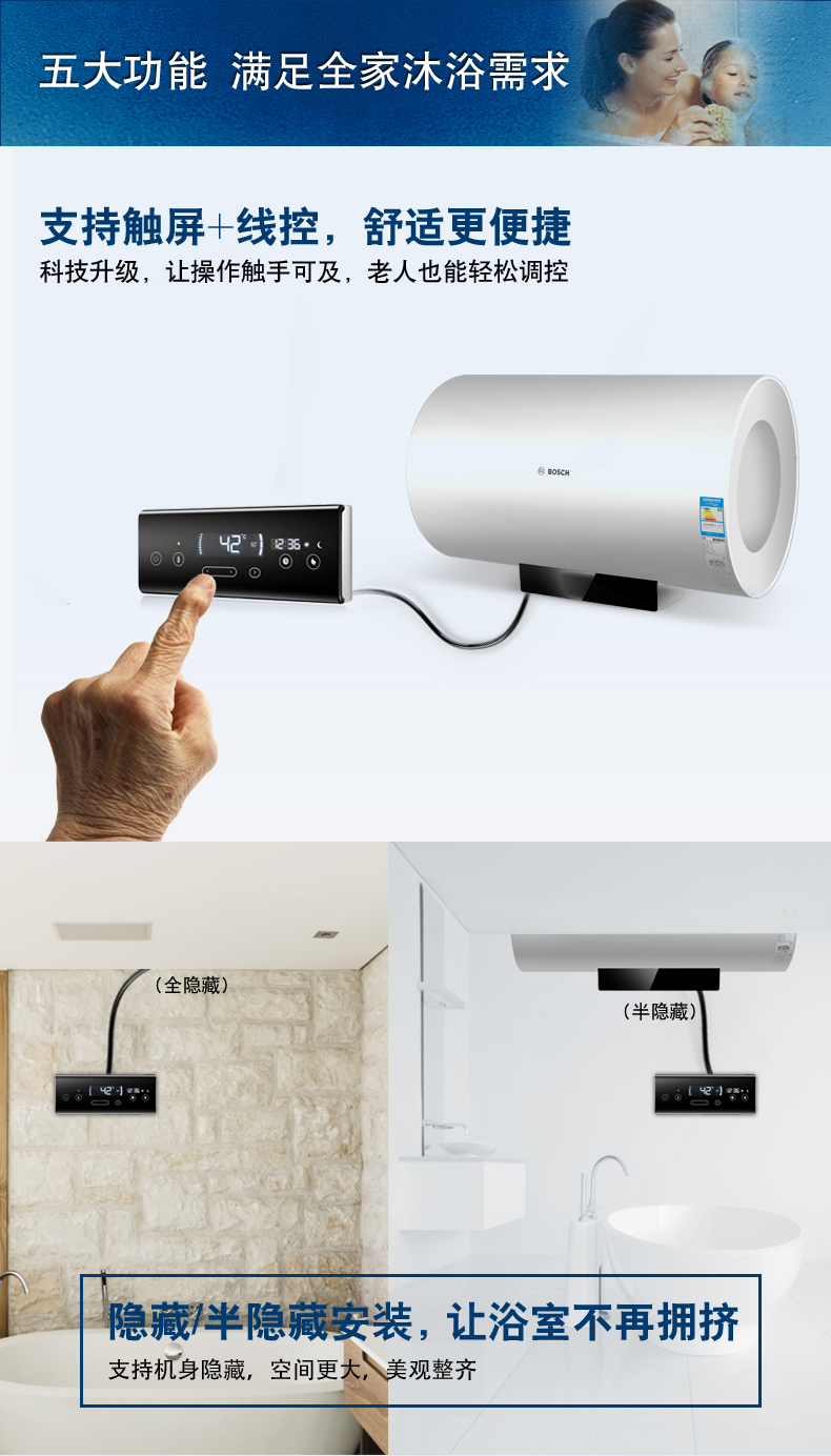 電子式控制,無(wú)機(jī)體控制器,遠(yuǎn)程線控器,可隱藏或半隱藏安裝??蛇x容積為50L/60L/80L/100L。